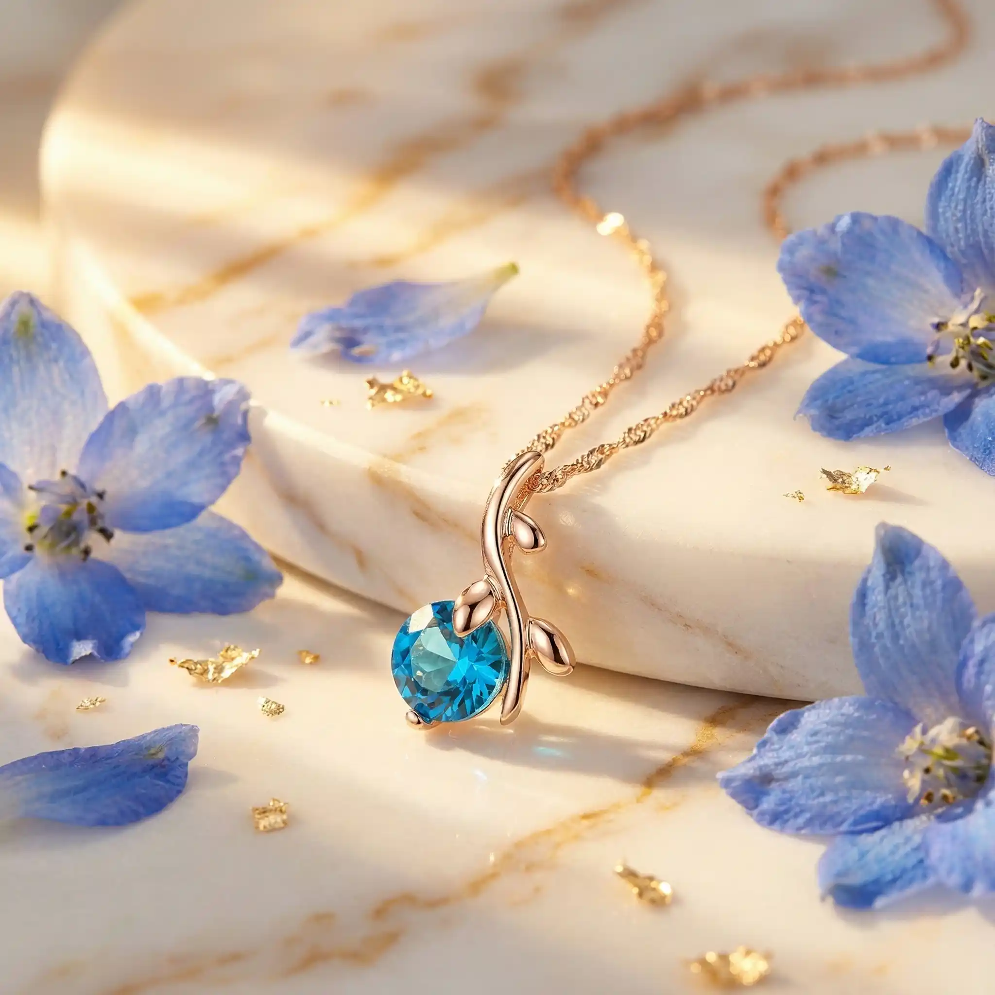 Вдъхновен от нежността на пролетта. Изящна комбинация от Rose Gold (18К покритие) и дълбоки Azure сини кристали.